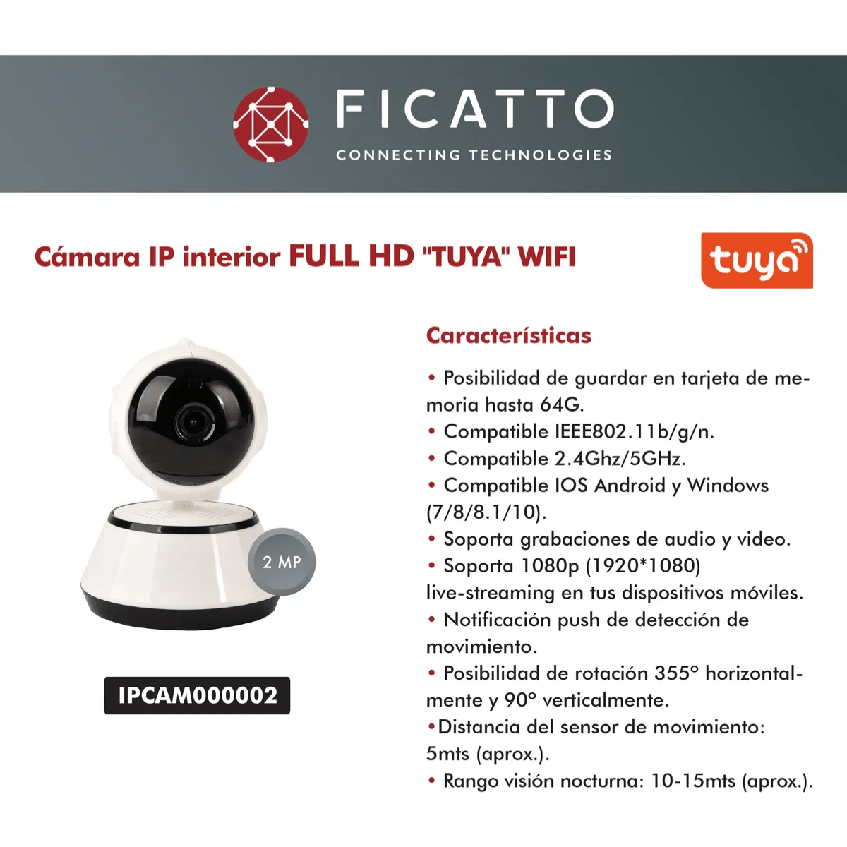Ideal para quienes buscan una solución de seguridad accesible y eficiente, la cámara de Ficatto es una opción confiable para la protección de tu hogar. Aumenta tu tranquilidad y mantente conectado con lo que más valoras.